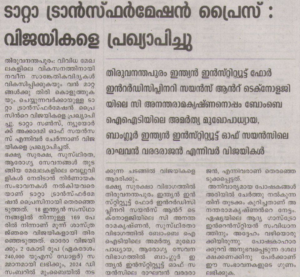 | Title: | NIIST director C. Anandharamakrishnan wins Tata Transformation Prize 2024 |